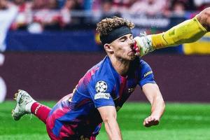 体育资讯04月15日讯 欧冠1/4决赛次回合,马竞vs巴萨,第26分钟,费尔明头球攻门,随后被穆索踢到头部,倒地撞向地面,当场血崩!